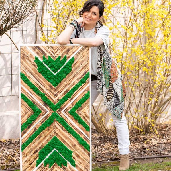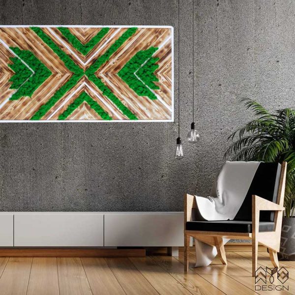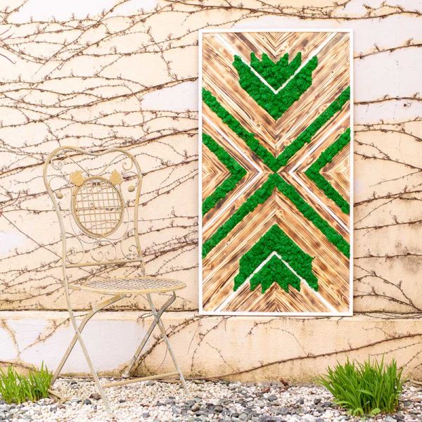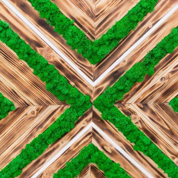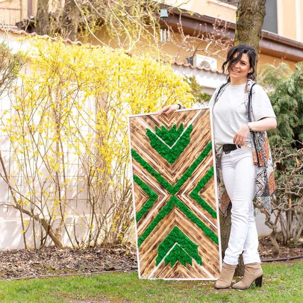 Each piece is made from natural wood, the colors are obtained from natural pigments and natural oils, bio and food safe. The green moss is stabilized and do not need any special attention if the decoration is kept in interiors. The moss is “feeding” with the humidity from the room.